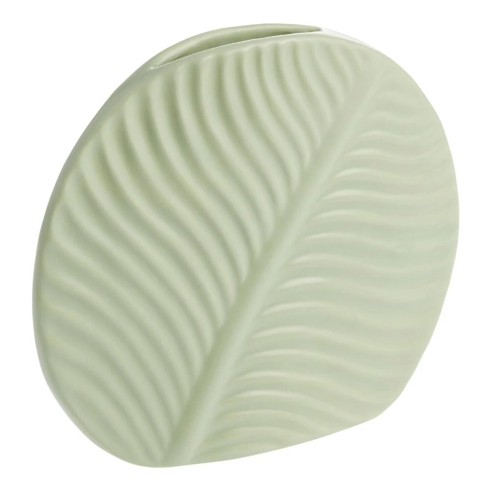 Bring a calming element of nature to any tabletop, shelf or mantel in your home with our exclusive tropical leaf-shaped ceramic vase. With a narrow silhouette and a semi-matte sage-green glaze, this handmade vessel sparks joy when filled with colorful flowers, greenery or simply displayed as decor on your shelf.