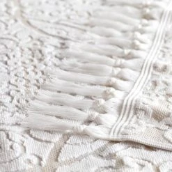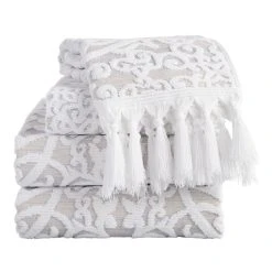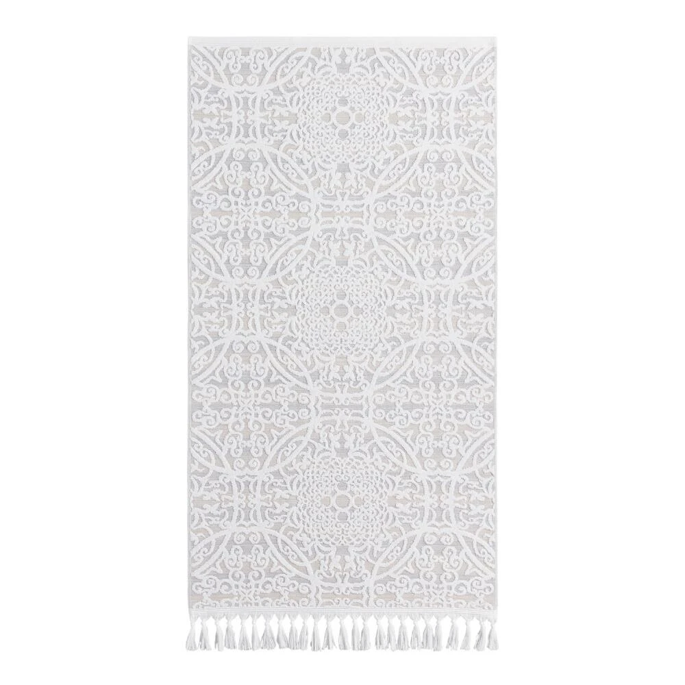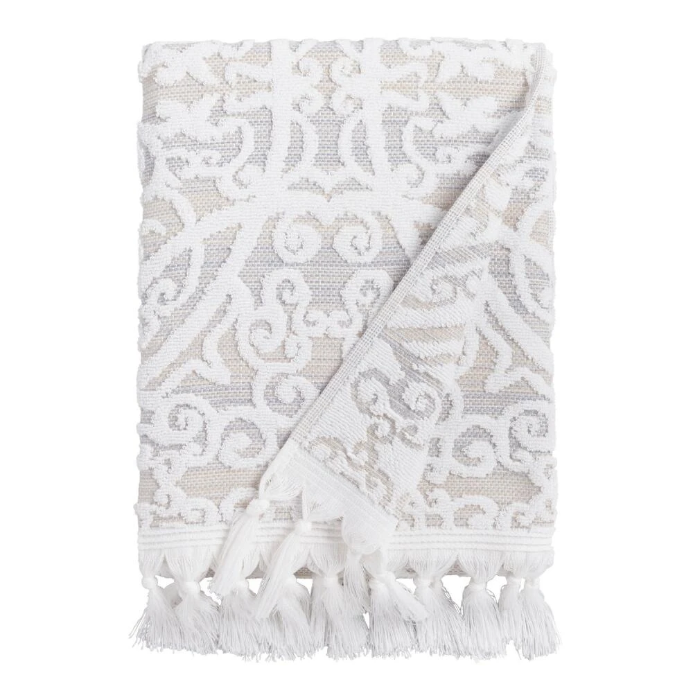 Featuring a sculpted medallion design in white on a taupe background, our exclusive bath towel brings a chic flair to your bathroom decor. White knotted fringe along the bottom adds a finishing touch.