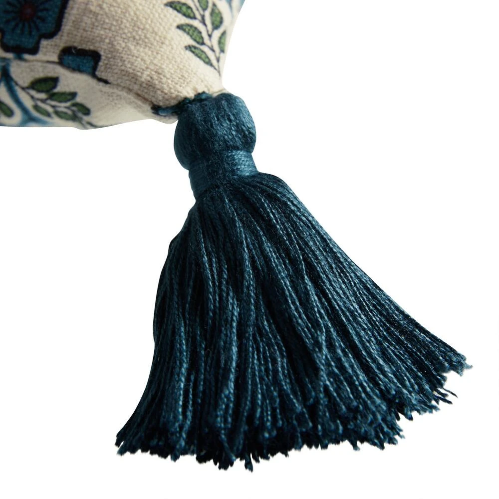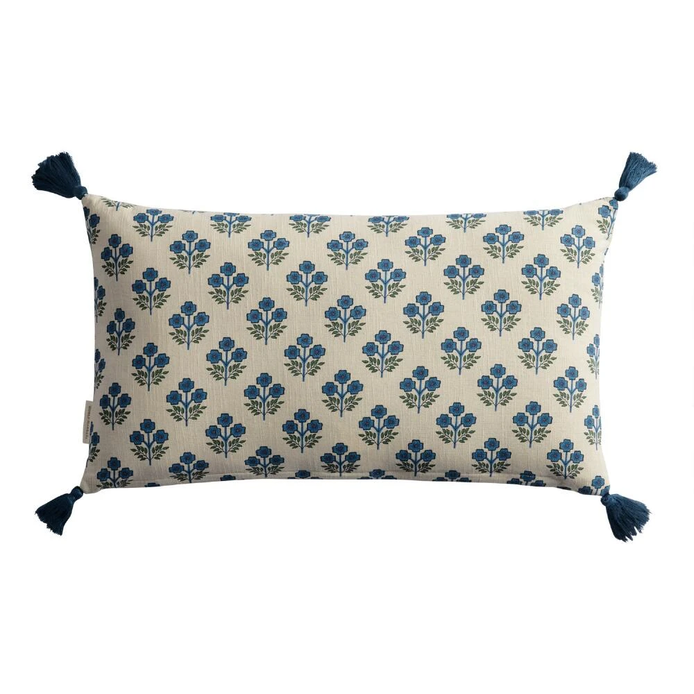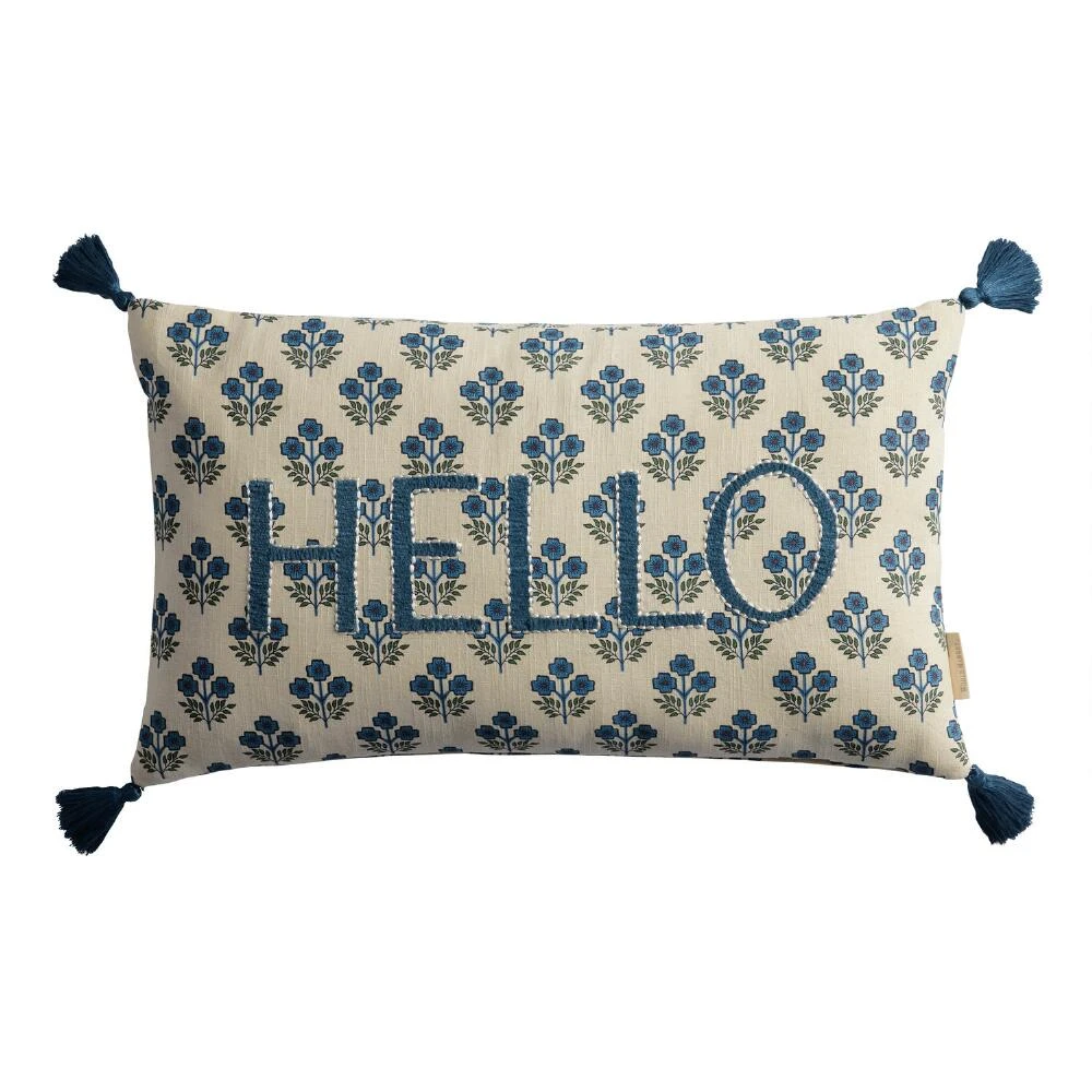 Add a pop of color and farmhouse whimsy to your home decor with this lovely embroidered lumbar pillow adorned with a sweet “Hello.” The repeating pattern of blue flowers with green stems will instantly brighten up any seating area or bedroom. With a removable insert and decorative tassels on all four corners, this pillow will make any houseguest instantly feel welcome.