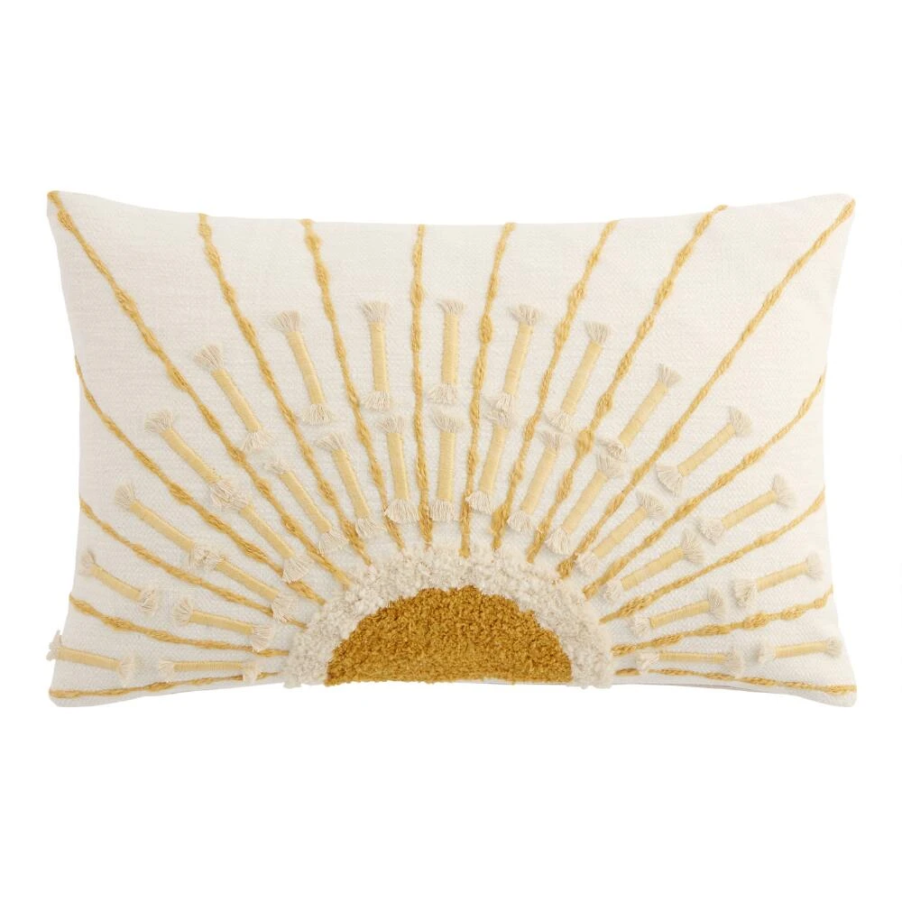 Featuring a tufted sunrise design in warm hues on a woven ivory ground, this lumbar pillow brings texture, comfort and a touch of art to seating. Mix and match with our variety of throw pillows or let this one shine on its own.