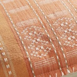 Woven stripes in sunny shades of orange are embellished with ivory and sage-green embroidery to create this richly textured throw pillow with artisanal appeal. Made with an innovative process that puts recycled water bottles to good use, its design is inspired by traditional Indonesian jacquard fabric. Completed by a whipstitch-trim border and a solid coral back, it updates your seating area, inside or out, with warm global style.