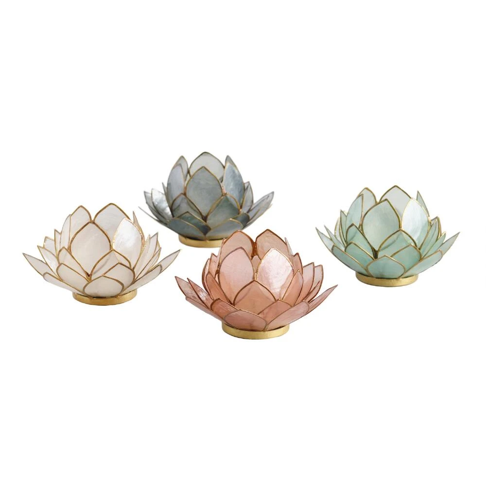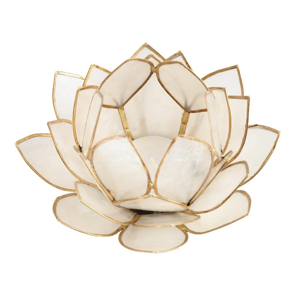 Artisans in the Philippines handcraft our tealight candle holder in a time-intensive process that requires harvesting, soaking, softening, cutting and bending each shell. The pieces are then artfully arranged in a hand-painted gold metal frame to create a white lotus flower, a symbol of love and devotion in many South Asian countries.