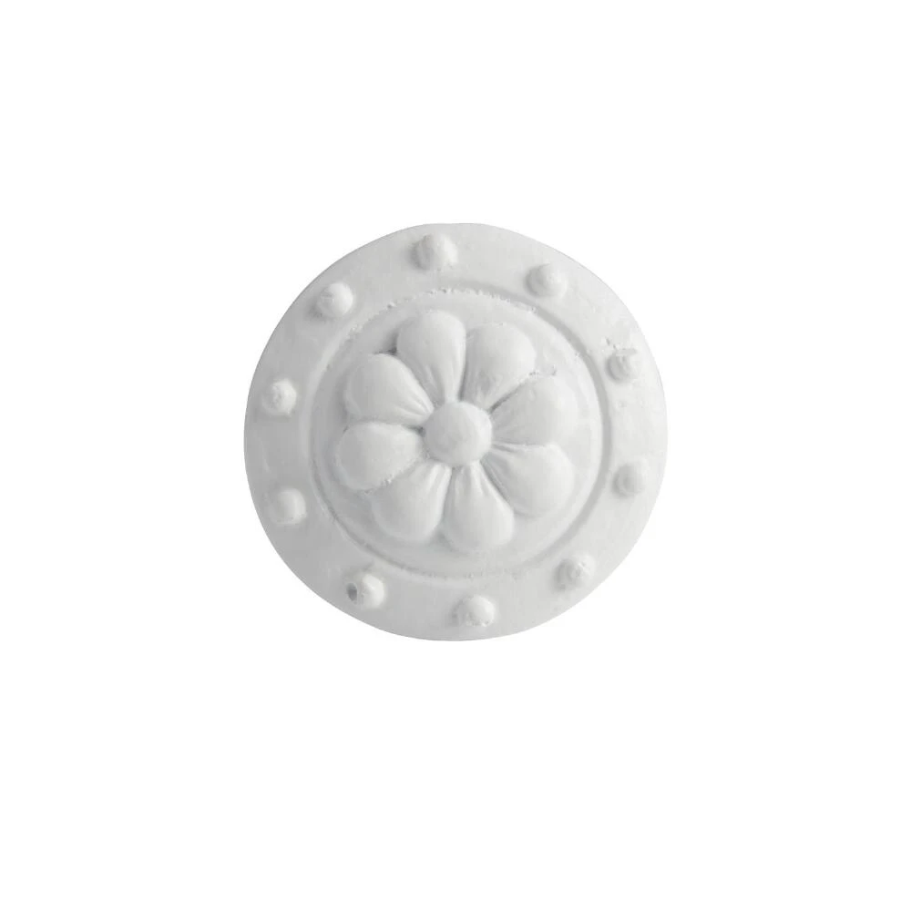A retro touch for kitchen cabinets or refinished furniture, these round decorative knobs each feature a raised flower ringed in polka dots. Crafted of white ceramic with a semi-gloss glazed finish, they bring appealing texture and charming style to your space.