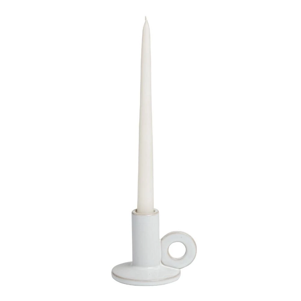 This classic white ceramic candle holder creates a contemporary look in your home. Its round handle is a nod to vintage candlestick holders but with a modern edge. This minimalist decor is perfect for displaying one or more dramatic taper candles on your mantel, console table, or bookshelf.