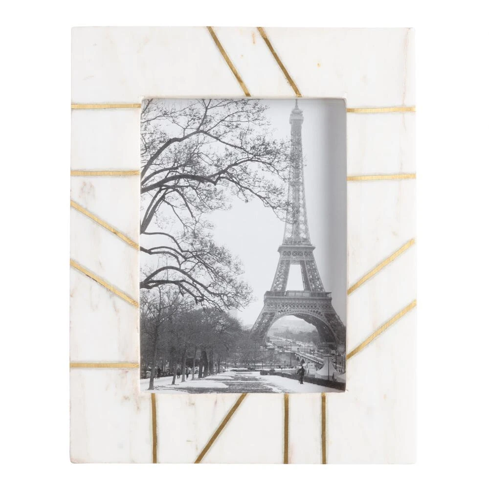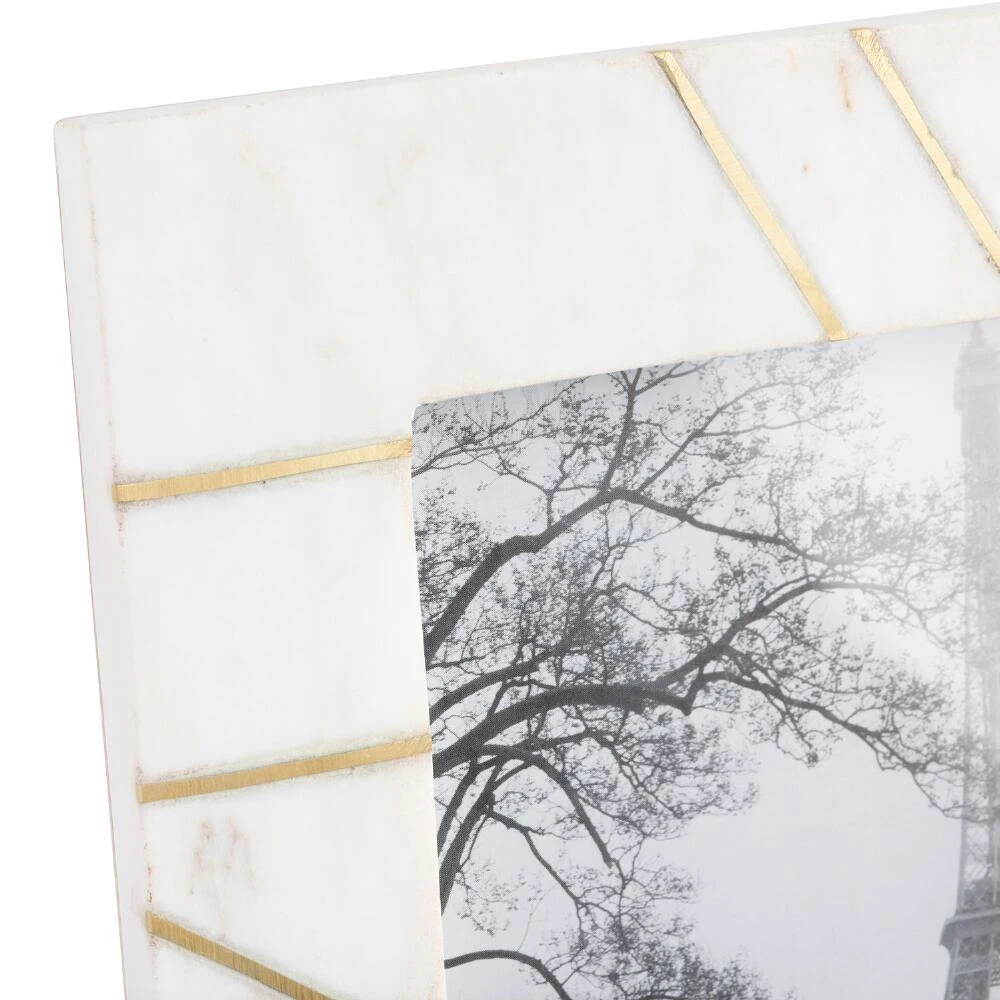 Crafted by hand from genuine white marble with asymmetrical brass-toned lines, this unique piece frames your favorite 5×7 photos with sophisticated flair. Its easel back allows you to position it vertically or horizontally on the fireplace mantel or in your office workspace.