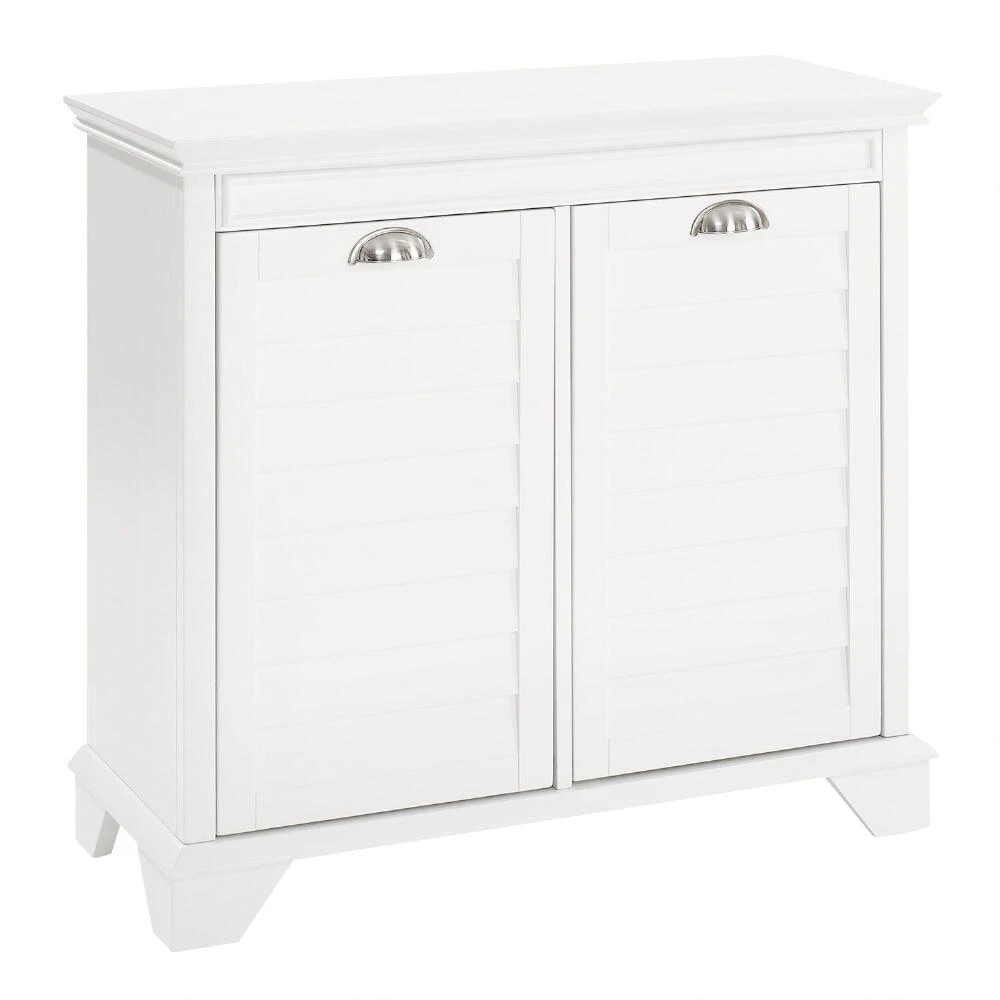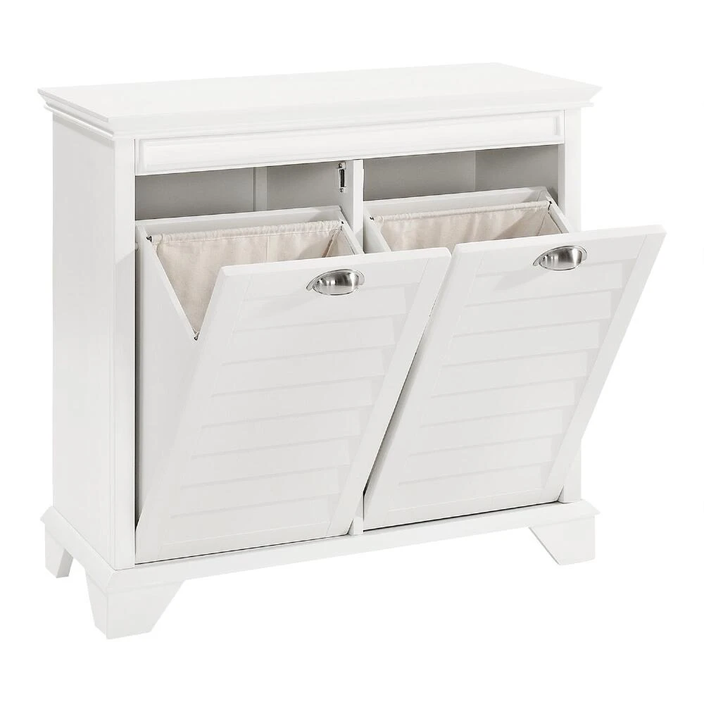 Keep dirty clothes contained and separated with our dual compartment hamper featuring a removable cloth bag for easy transport. Crafted of white-finished wood with classic details like louvered doors and metal hardware, this compact piece is ideal in the bedroom, bath or hallway.