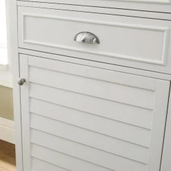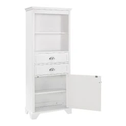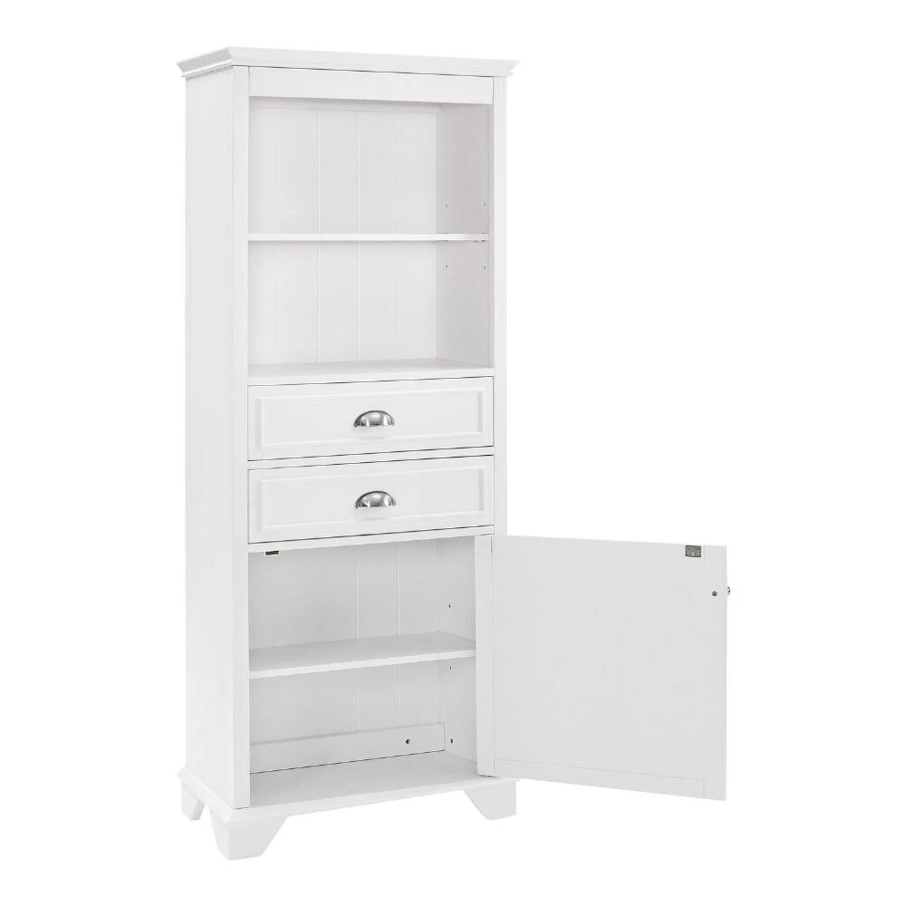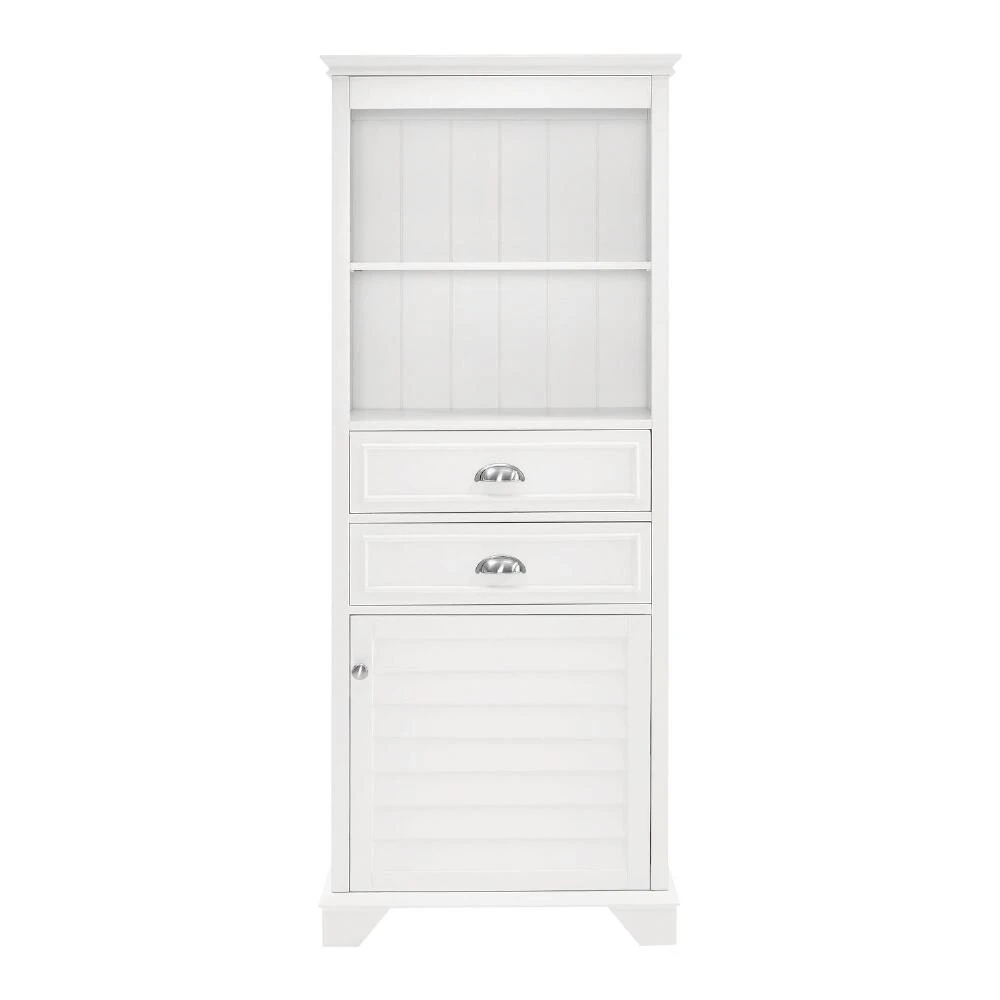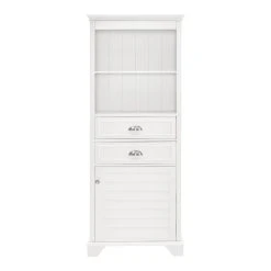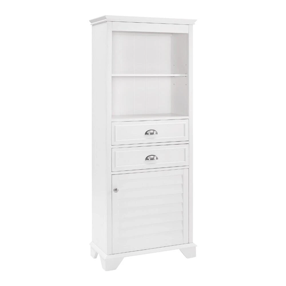 Maximize your bathroom storage with our wooden cabinet featuring two shelves, two spacious drawers and a large bottom cabinet with a louvered door for organizing your everyday essentials. Crafted of solid hardwood and veneer, this versatile piece is right at home in both traditional and contemporary spaces.