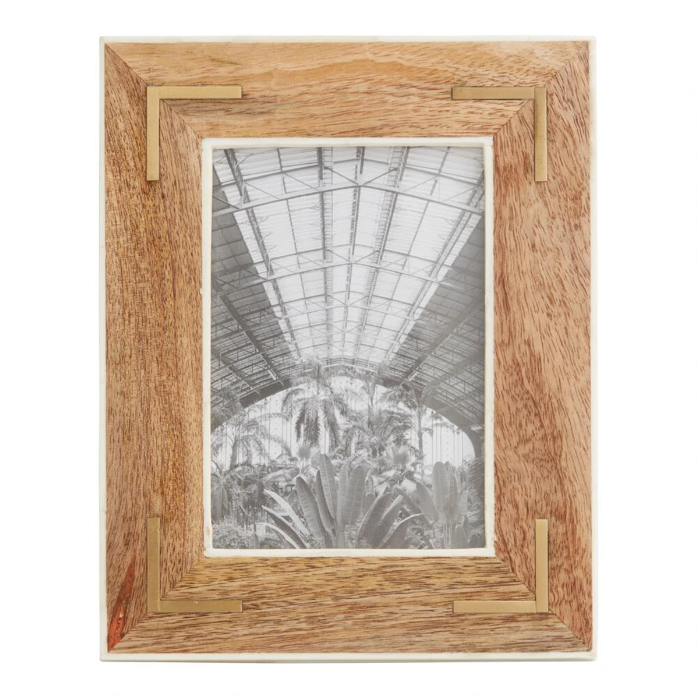 Brass and bone details add contrast and dimension to our exclusive mango wood frame. Featuring a natural finish that beautifully showcases the texture of the mango wood grain, this handcrafted 5×7 tabletop frame makes a sophisticated display of a treasured photo.
