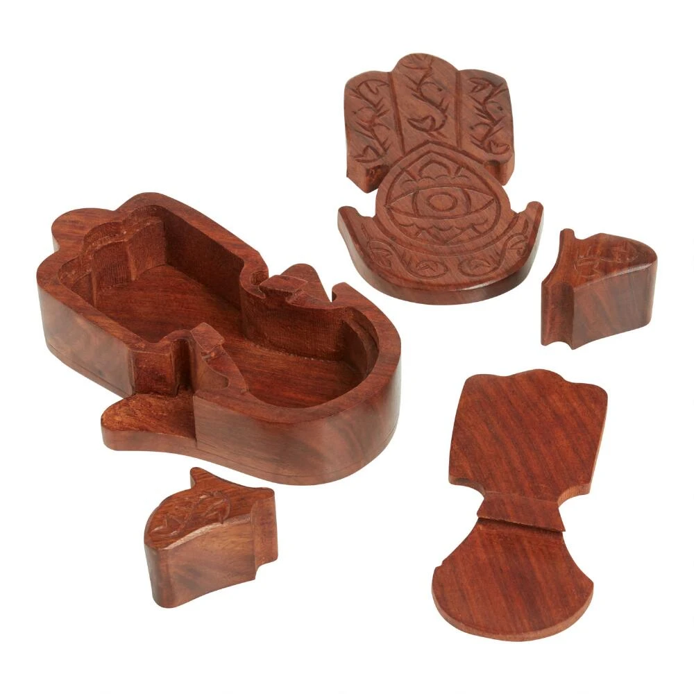 Hand carved by Indian artisans, this dark-wood puzzle box brings rustic beauty and playful charm to your table or desktop. In the shape of the hamsa, an ancient symbol thought to ward off evil and welcome good fortune, it’s an auspicious spot to tuck away tiny treasures.