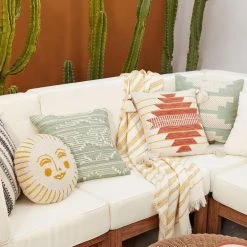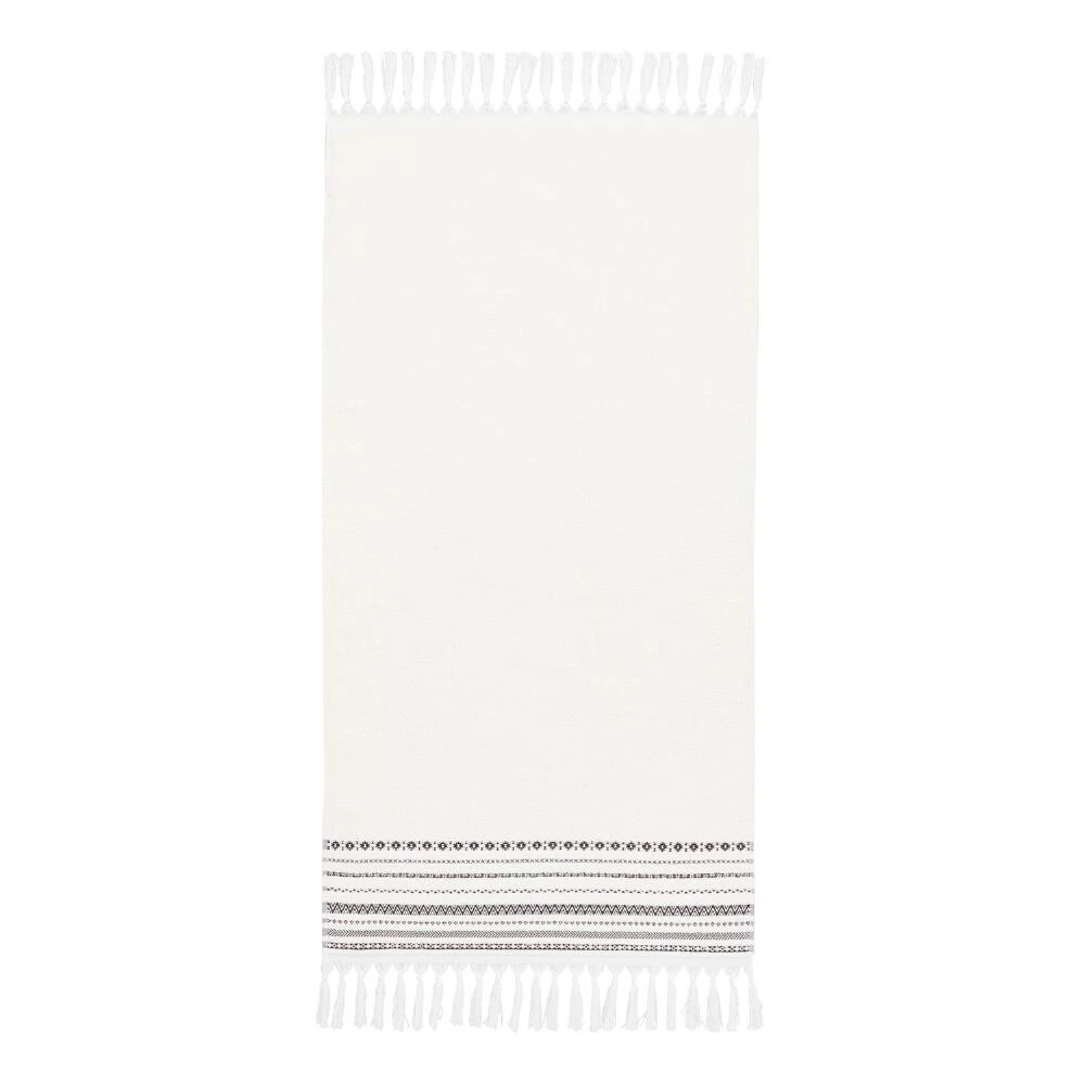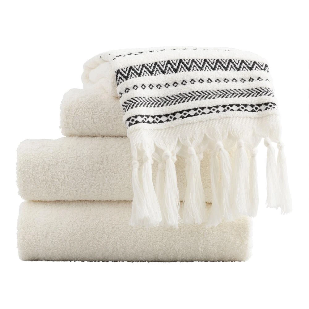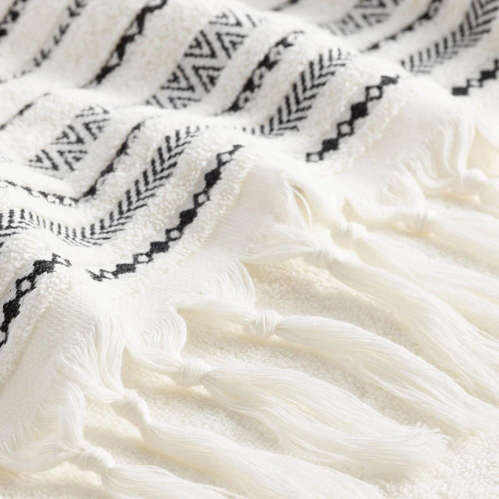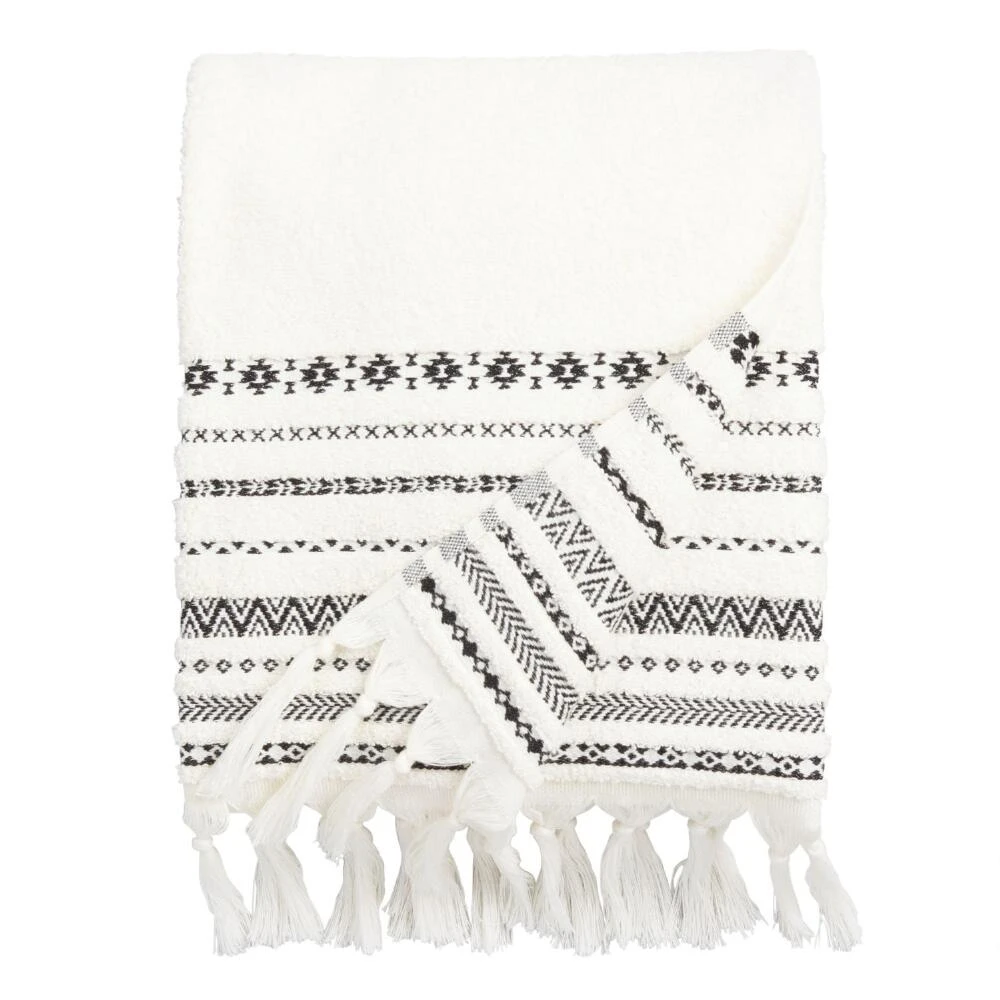 Our exclusive bath towel showcases a black geometric-striped border design on a solid ivory background, complete with knotted tassels on both ends. It adds a graphic pop of subtle pattern to your bathroom.