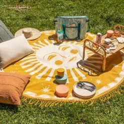 World Market Round Golden Yellow and Ivory Cotton Picnic Blanket